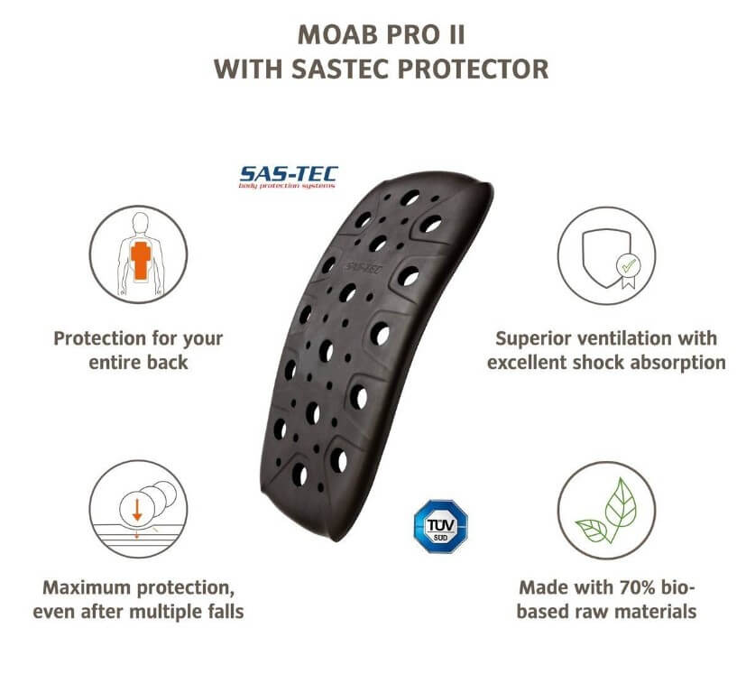 Plecak jest bezpieczny w użytku ze względu na wielozadaniowy, zintegrowany ochraniacz SAS-TEC SCA 500, który styka się z ciałem. Co ważne, można go w prosty sposób dopasować do rozmiaru tułowia dzięki pasowi biodrowemu - reguluje się go w pionie o 6 cm. Ochraniacz zabezpiecza ciało przed niebezpiecznymi skutkami uderzenia. Należy go wymienić po upadku oraz po upływie maksymalnego okresu użytkowania wynoszącego 5 lat. Ochraniacz testowany zgodnie z normą DIN i certyfikowany przez TUEV Sud.