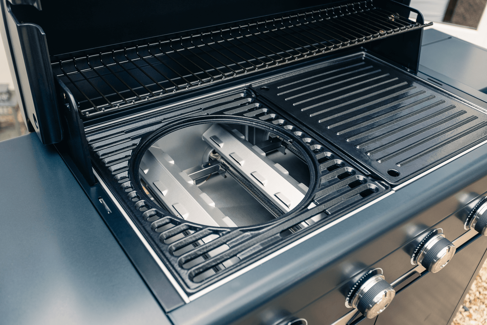Taca ociekowa pełni jeszcze jedną, niezwykle istotną funkcję. Podczas grillowania palniki delikatnie podgrzewają wodę na tacy do temperatury 60 stopni. Wydostająca się para wodna zapewnia, że mięso się nie wysusza i staje się chrupiące i soczyste.