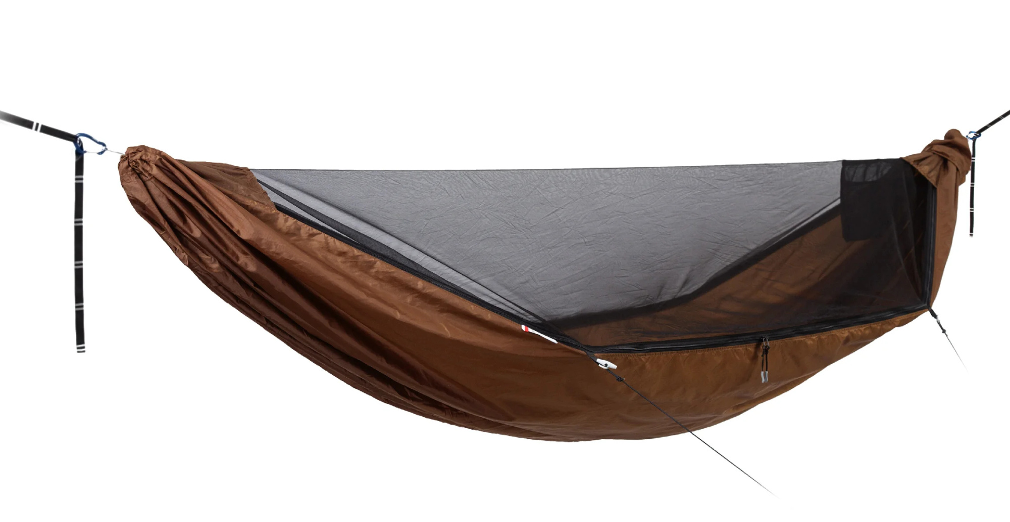 Kluczowym elementem DRAKI jest zintegrowana moskitiera z ultragęstej siatki. Zapomnij o irytujących ukąszeniach owadów! Moskitiera skutecznie powstrzyma nawet najmniejsze meszki i kleszcze, zapewniając Ci spokojny sen bez nieproszonych gości. Dwustronny zamek błyskawiczny na całej długości umożliwia łatwe wchodzenie i wychodzenie z hamaka, a w razie potrzeby moskitierę można całkowicie odpiąć i schować do dedykowanego pokrowca. Co ważne, moskitiera nie wymaga dodatkowych linek ani odciągów – jej konstrukcja sprawia, że idealnie dopasowuje się do kształtu hamaka.
