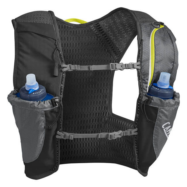 W tylnej części umieszczono poziomą kieszeń przeznaczoną do przechowywania odzieży. Na bokach znajdują się elastyczne kieszenie, do których masz dostęp w trakcie biegu. Z przodu kamizelki wygospodarowano miejsce na dwa bidony o pojemności 500ml. Po lewej stronie masz do dyspozycji zapinaną kieszeń na telefon, natomiast po prawej stronie schowasz niezbędne akcesoria.