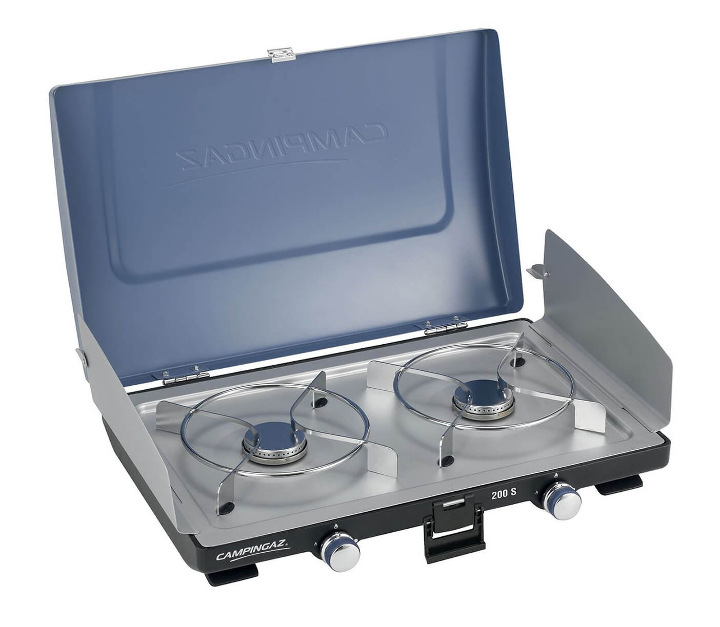 Kuchenka turystyczn posiada dwa palniki, żaroodporne panele boczne i stalową pokrywę, która chroni płomień przed wiatrem. Płomień można regulować za pomocą ręcznych.