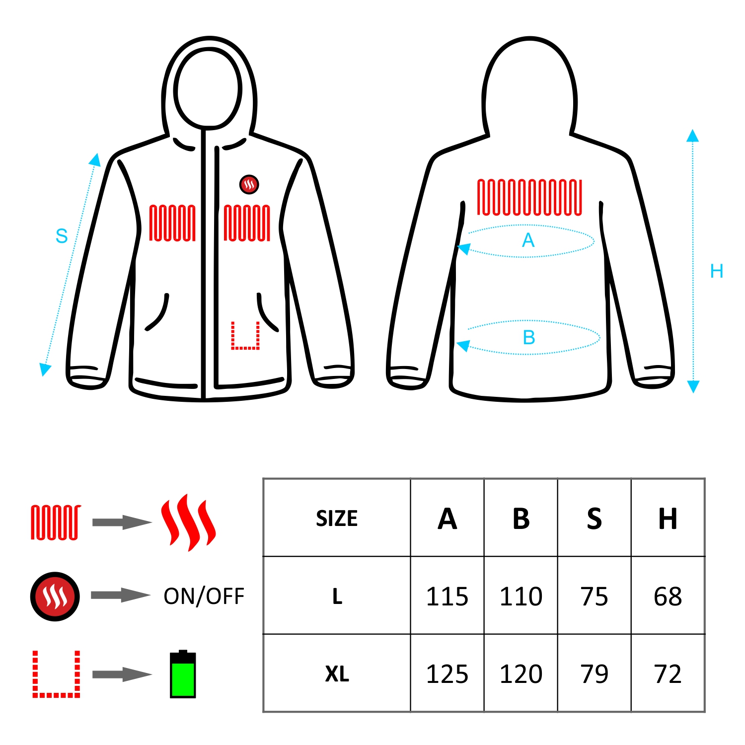 W zestaw wchodzi: kurtka, powerbank 5200 mAhz ladowarką sieciowa, zestaw przejściowek (EU, UK, US), wygodny pokrowiec