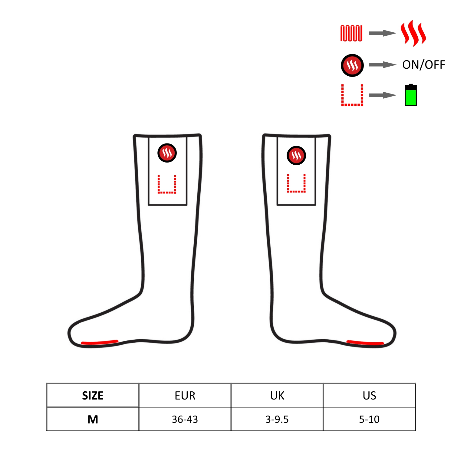 | informacja | element grzewczy: 5 W - włókno węglowe; ogrzewany obszar: dolna część stopy; bateria: 2x 3350 mAh (12.4 Wh), Li-Ion; ładowarka sieciowa: USB, 5 V, 1 A (zestaw zawiera kabel ładujący USB); tryby pracy: HI (44°C), MED (39°C), LO (34°C); czas pracy: 6 h (LO) |