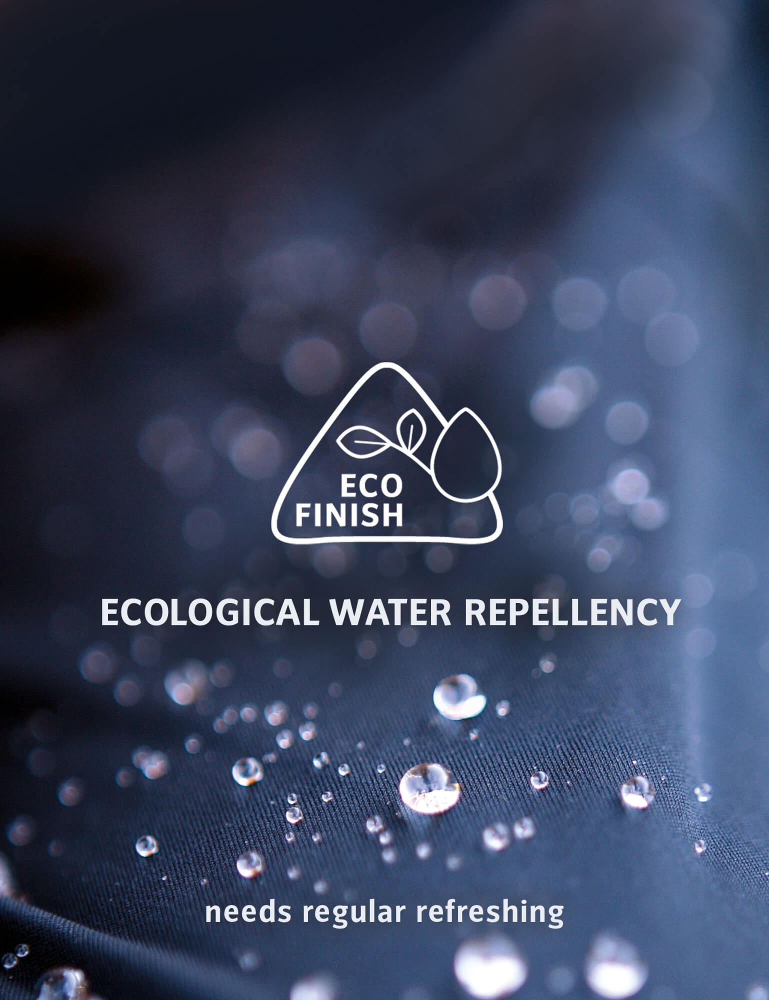 Większość z plecaków, sakw, toreb i walizek została wykończona hydrofobową warstwą Eco Finish – dzięki temu produkty są odporne na wodę oraz plamy. Woda perli się na powierzchni i natychmiast spływa z materiału, dzięki czemu nie wsiąka do wnętrza bagażu. Należy jednak pamiętać, aby regularnie powtarzać impregnację, aby móc cieszyć się jak najdłużej właściwościami sprzętu.