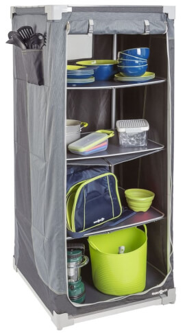 Wygodna w użytkowaniu, szafka kempingowa o nowoczesnym designie, wyposażona w blat i cztery półki. Umożliwia wygodne przechowywanie rzeczy na biwaku, kempingu i łatwy dostęp do zawartości.