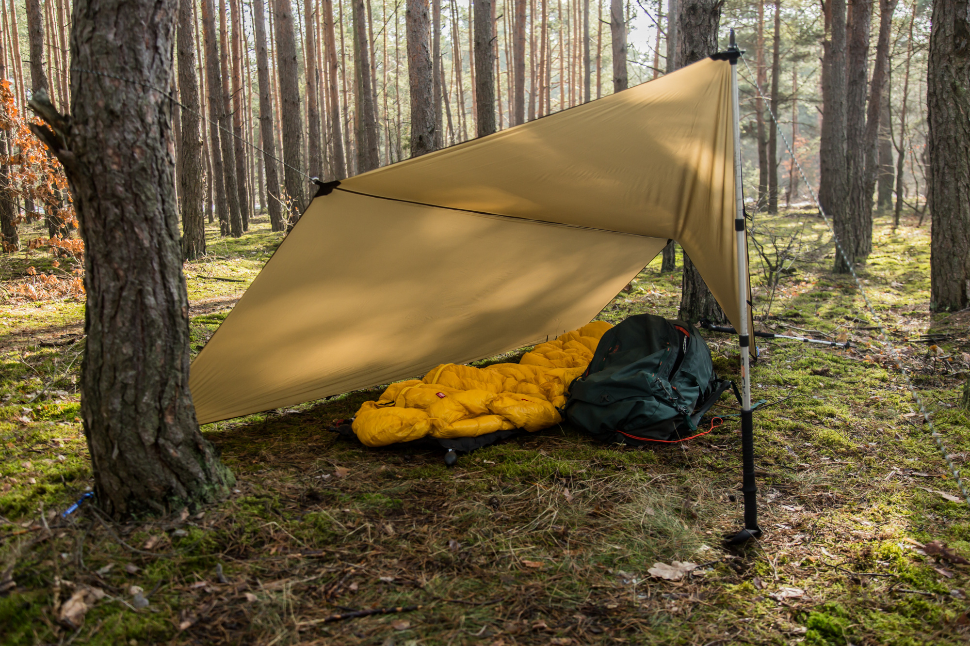 Tarp Solo można rozbudować za pomocą innych produktów firmy Lesovik! Aby rozstawić tarp Solo, należy zakupić osobno minimum 6 śledzi Spig lub Spig Ul.