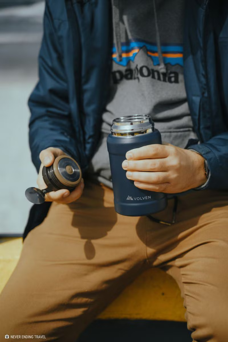Szeroki otwór ułatwia także czyszczenie termosu. Nowoczesny design i kolorystyka kryje za sobą jeszcze jedną funkcjonalność - powłoka zewnętrzna jest trochę chropowata, co ułatwia trzymanie termosu Volven Arctic Lunch w dłoniach.