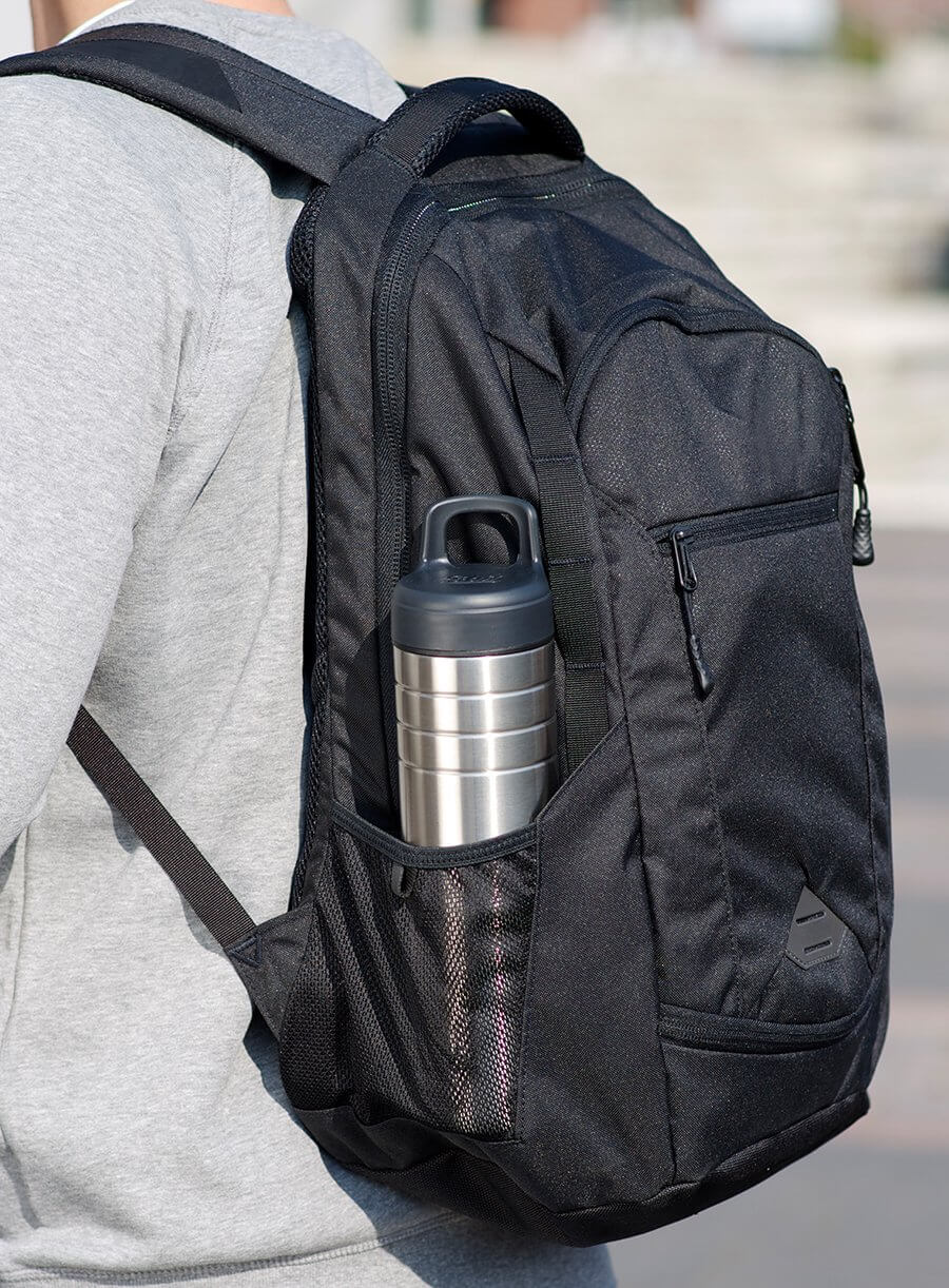 Model wykonany jest z niezwykle trwałej stali nierdzewnej. Na korku znajduje się specjalny uchwyt, dzięki któremu łatwo przytroczysz go do plecaka. Pod spodem znajduje się specjalna podkładka non-slip, która zapobiega przemieszczeniu się kubka po powierzchni.