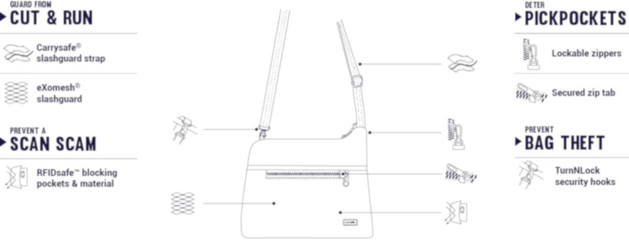 Torebka idealnie sprawdzi się podczas podróży dzięki kieszeniom RFIDsafe, które chronią paszport i portfel przed zeskanowaniem i kradzieżą danych osobowych, gdyż blokują częstotliwości od 10MHz do 3GHz używanych w większości elektronicznych dokumentów i kartach płatniczych.