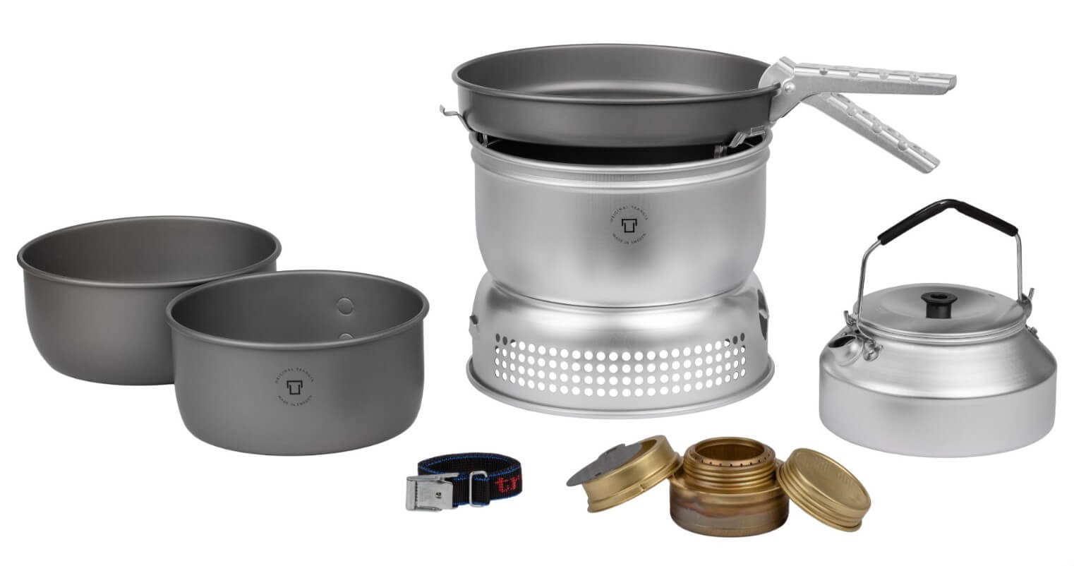 Zestaw turystyczny marki Trangia sprawdzi się w podróży dla 3-4 osób. Wraz z palnikiem w zestawie znajdują się dwa garnki o pojemności 1,5L i 1,75L. patelnia, uchwyt, pasek i czajnik 0,9L.