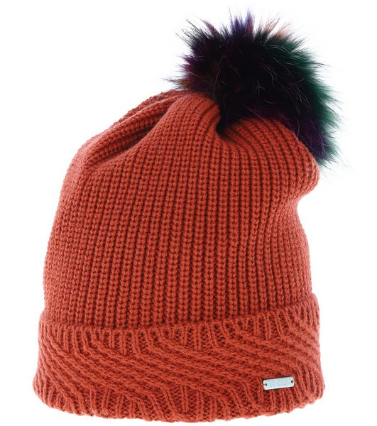 Starannie dobrana kolorystyka pasuje do obecnych trendów sezonowych, a przede wszystkim współgra z kolorami tęczowego pompona z naturalnego futra jenota. Dodatkowy beżowy pompon nadaje czapce uniwersalnego charakteru.